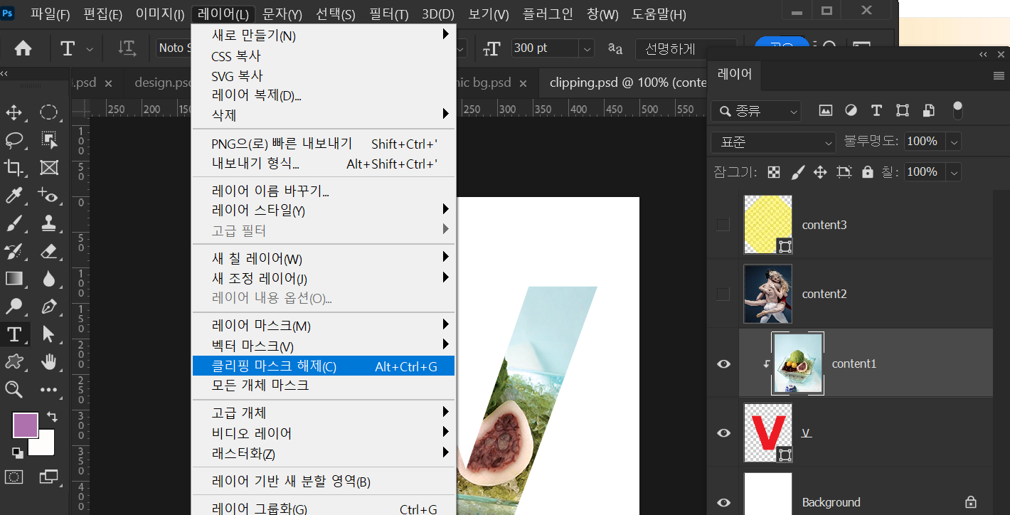 위에있는 여러가지 사진들도 가까이 위치 시킨 후, 동일한 방법으로 클리핑 마스크가 연달아 가능하다. 부모와 자식의 관계로 생각하면 쉽다.