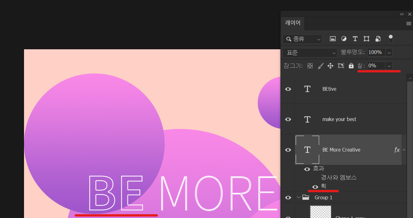 효과 클릭해서 '획' 누르고 바깥쪽으로 효과주고, 속성 돌아와서 fii(칠)값을 0으로 두면 글자가 빈화면이 나타난다.
